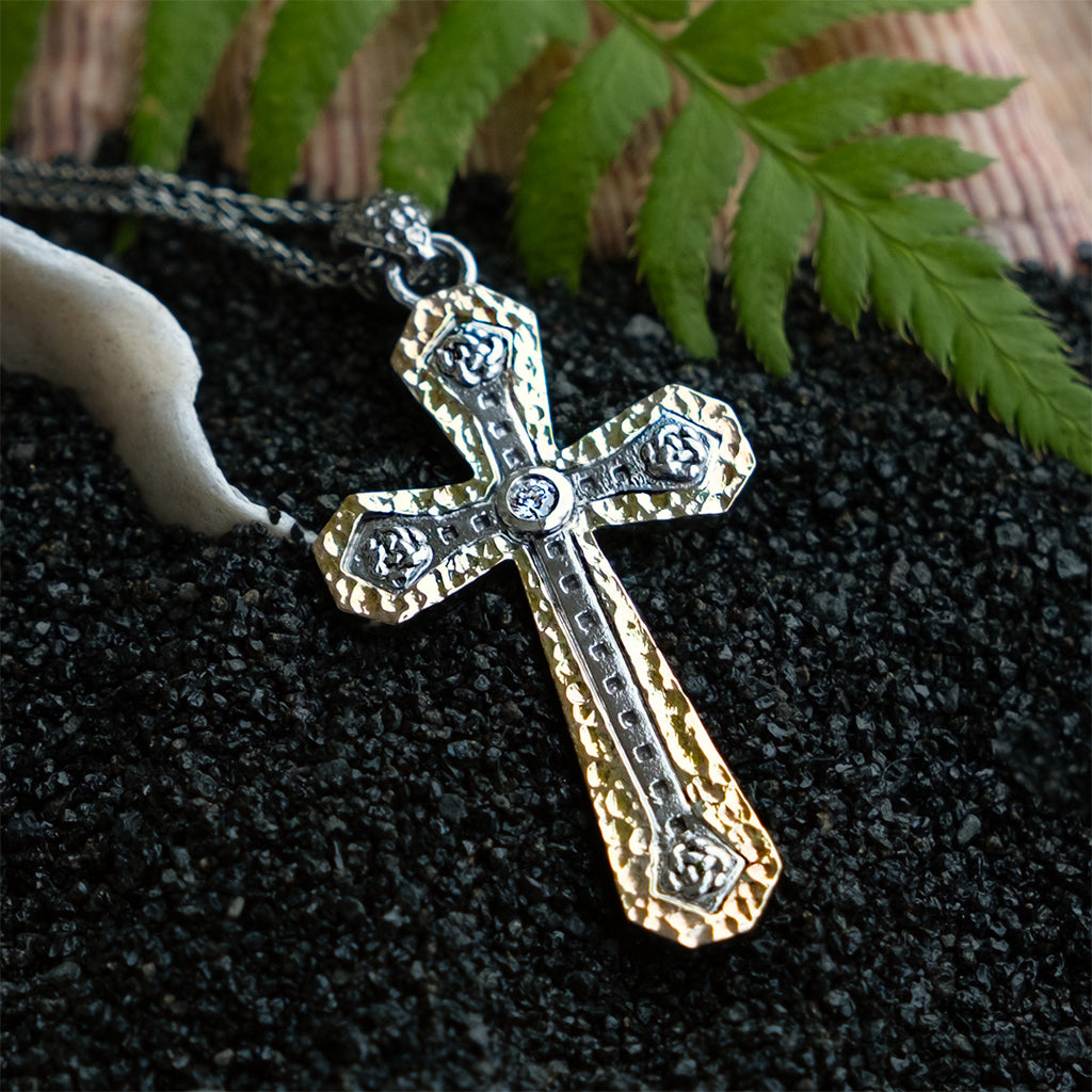 Silver and 10k Gold Celtic Cross - Ruthenium and Cubic Zirconia