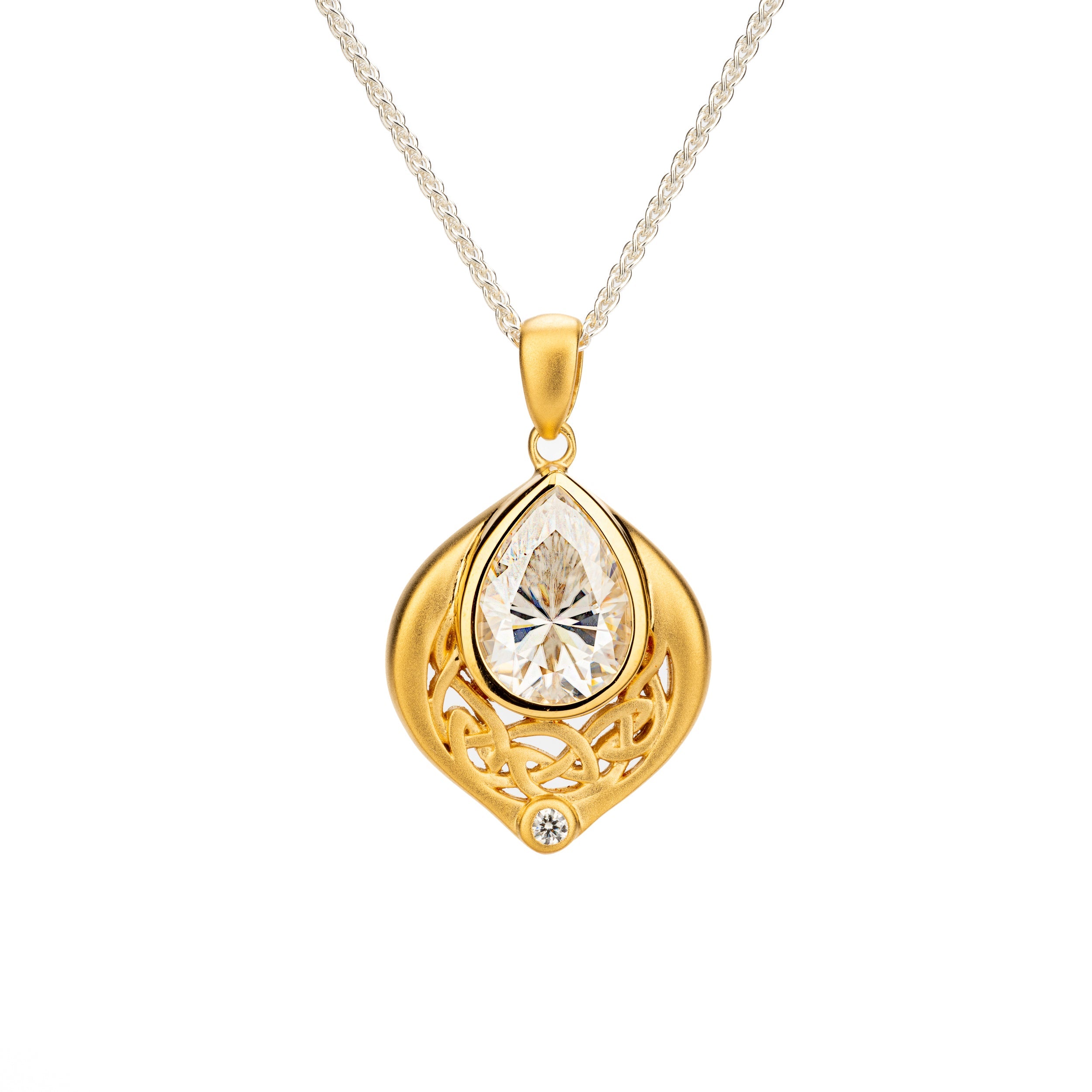 Materials: 24k Vermeil (3 micron) over Sterling Silver with White Moissanite (Pear 10mm x 14mm, Round 2.5mm)