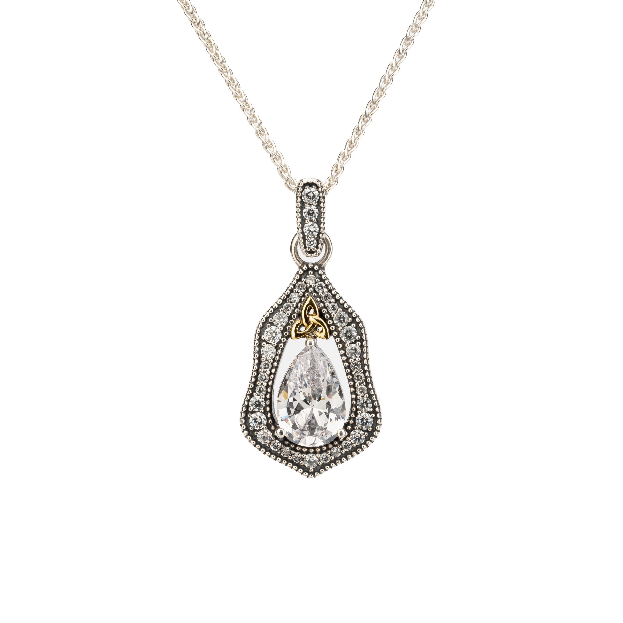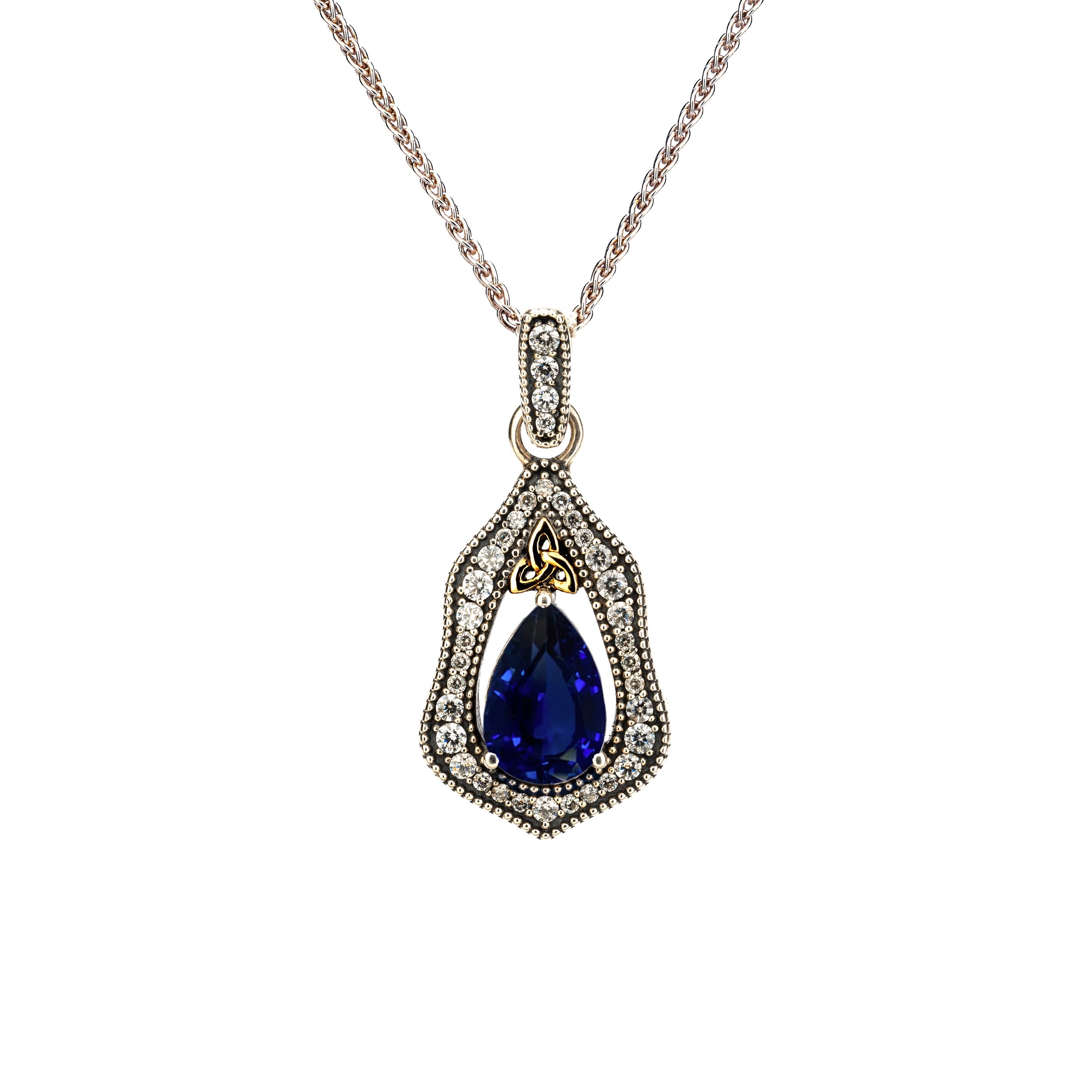 Materials: Sterling Silver with 24k Vermeil (3 micron) and Lab Grown Blue Sapphire or White Moissanite (Pear 8mm x 12mm), White Moissanites (Round 2./1.8/1.3mm)