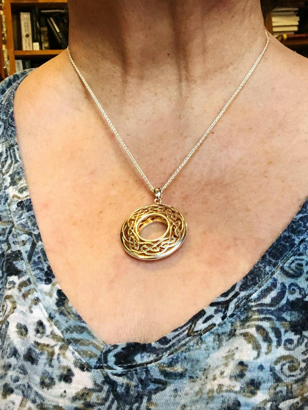 This gorgeous round pendant, inspired from the Celtic legend of people moving between the two realms, physical and faerie, is unmistakably traditional yet surprisingly modern. Its contemporary style that is reinvented from an ancient fable gives it a unique charm.